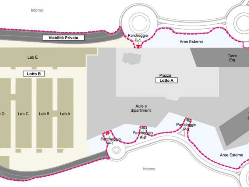 The project involves the construction, in two phases, of a complex of buildings intended to host the New Polytechnic School of Genoa, along with the provision of public and private parking facilities. The limited area and the diversity of spaces required by the University led Architect Mario Bellini to design the entire Campus as a single, articulated building, with the exception of the heavy laboratories, for which internal vehicular circulation was required. Within the perimeter of the Campus (total area approximately 400,000 sqm), a surface of about 16,860 sqm is occupied by a base platform that houses, on the lower levels, two parking floors (P-2 for public use and P-1 for private use), and on the upper levels, public and collective functions of the University Institute, including outdoor spaces and accessory volumes (such as a café and administrative offices). Inserted within the platform are two ten-story blocks, each with a footprint of approximately 90 x 20 meters, which accommodate the university departmental spaces. These two towers are arranged according to the radial lines defined by the original Master Plan, whose central directions converge into the park, the heart of the Science and Technology Park.