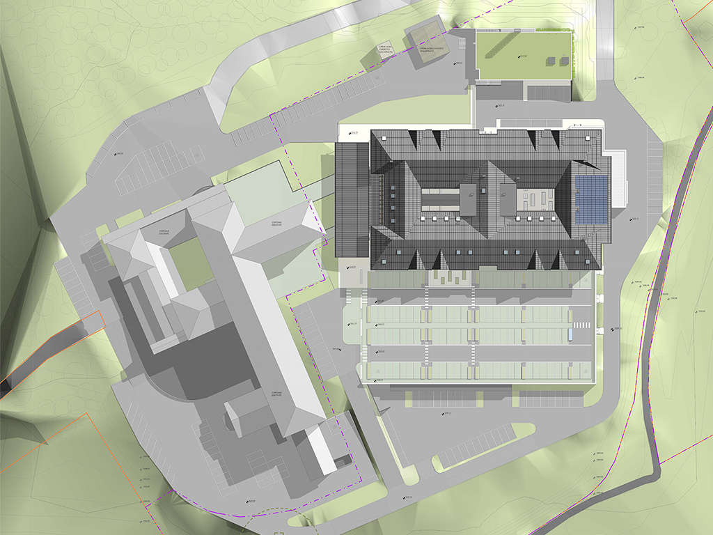 L’ospedale di Asiago, la cui attività è iniziata nel 1947 è situato a sud-est del centro abitato, a circa 2,5 Km da Asiago, e più precisamente in una zona collegata alla strada provinciale Asiago-Bassano. Il presidio ospedaliero si configura come un organismo edilizio composto da due nuclei distinti posti l’uno a nord e l’altro a sud del nuovo ingresso, elemento architettonico ad un solo livello ove troveranno localizzazione la reception e il bar/edicola. Il nucleo situato a nord utilizza i volumi dell’attuale ospedale, mentre nel nucleo a sud, ubicato in un nuovo volume edilizio, vi saranno i servizi sanitari “diurni” e “per acuti”.